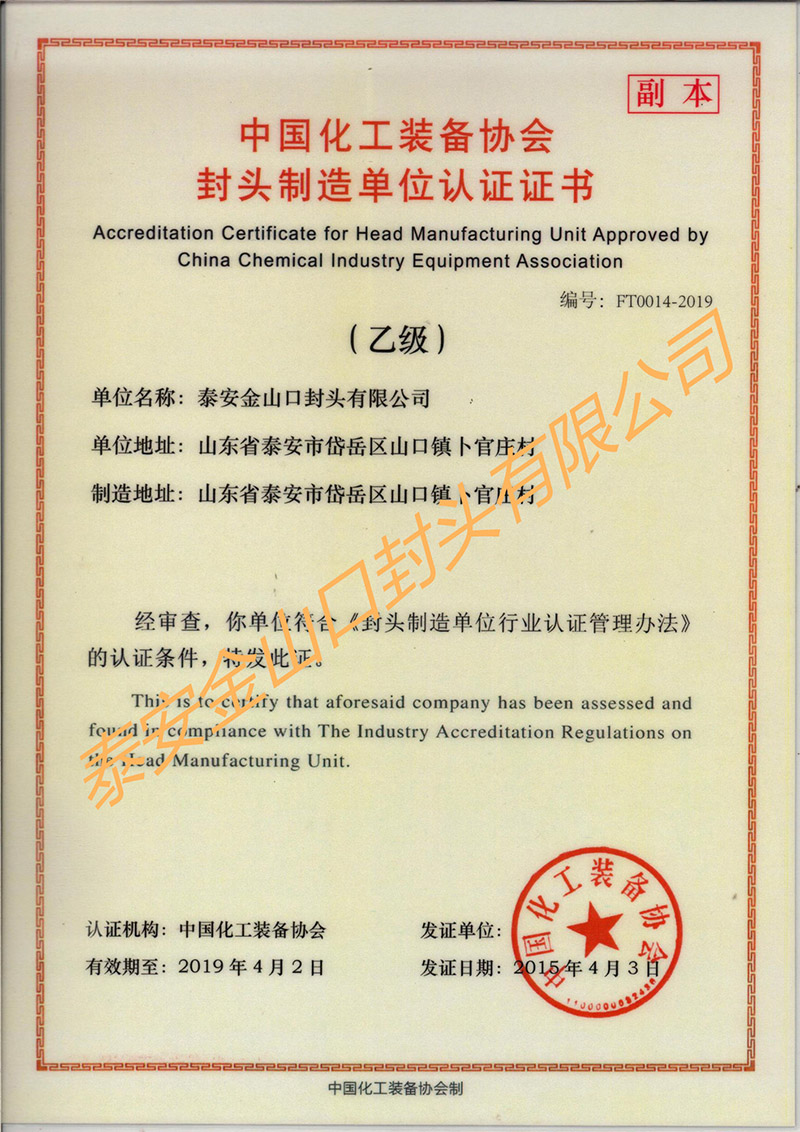 封頭制造單位認(rèn)證證書